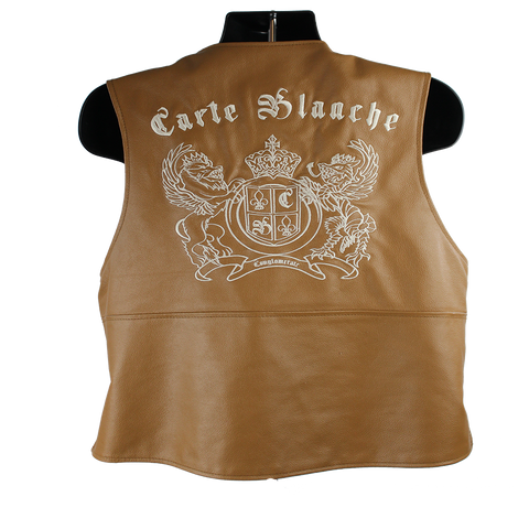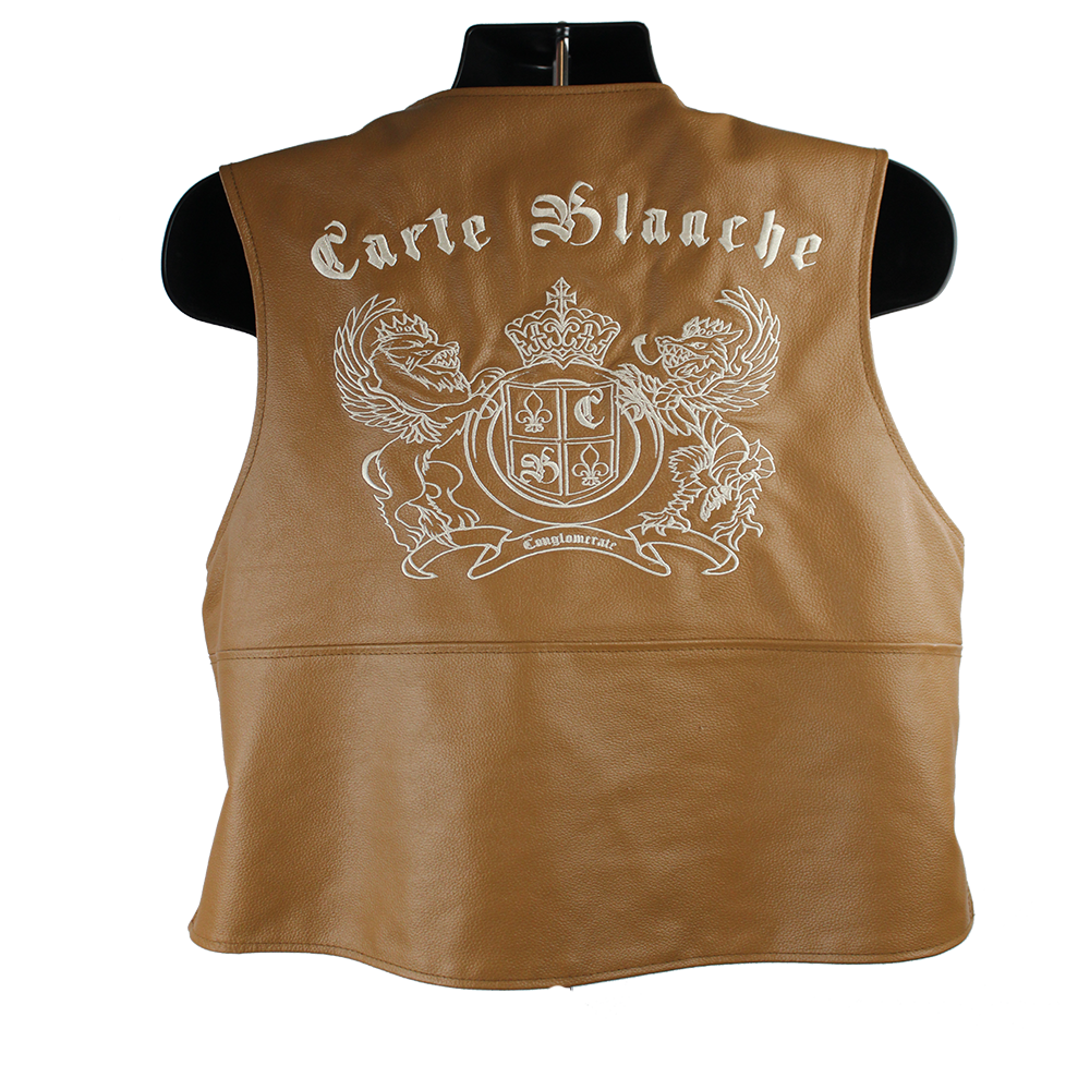 *Our all leather vest features a 20,000 stitch logo and name on front. it also includes a 180,000 stitch logo on back. Can be ordered in different colors .