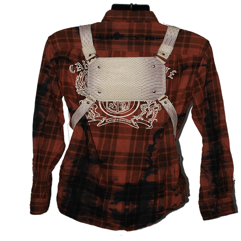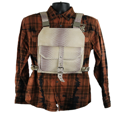 Hand stitched leather chest rig made with real snake skin featuring chrome buckets.